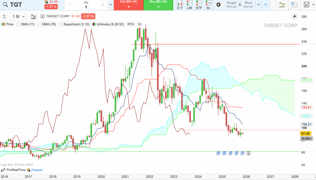 Target Corporation traverse une période critique en 2025. Si l’entreprise conserve des atouts solides (marque forte, dividende attractif, réseau physique étendu), elle fait face à des défis majeurs : baisse des ventes, érosion des marges, retard dans le e-commerce et concurrence féroce de Walmart et Amazon Target CorporationCNBC.