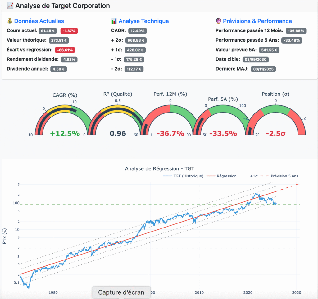 Solidité financière et dividendes Target génère un chiffre d’affaires de 106,57 milliards de dollars en 2025 avec un résultat net de 4,09 milliards de dollars, et maintient une politique de dividende attractive avec un rendement de 5,28%, versé sans interruption depuis 42 ans Rendement Bourse.