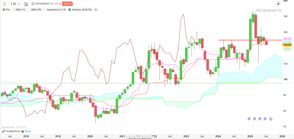 En mensuel, le cours est au dessus de son nuage donc en tendance positive, elle évolue entre ses moyennes Tenkan et Kijun avec une resistance majeure a 150,10