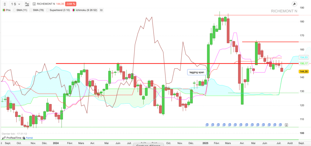 En Unité journalière, les cours sont dans le nuage, signe de neutralité, le bas du nuage (plat de SSB) fait office de support a 143,75, pas de directionnel donné , la lagging span est elle egalement dans le nuage.