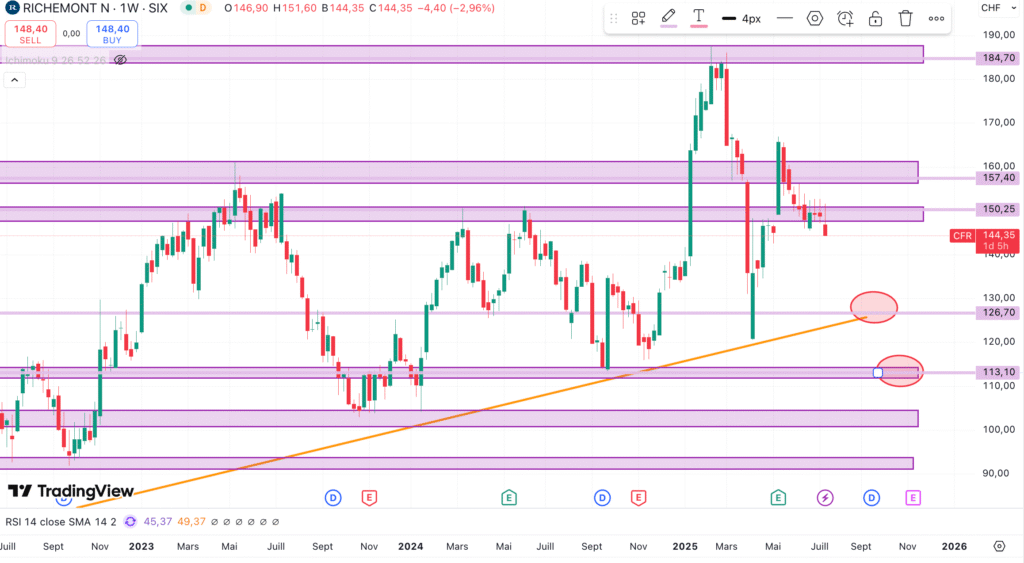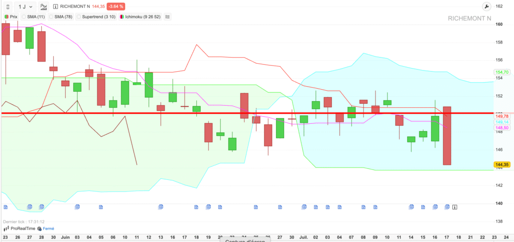 En analyse classique, on voit les supports en cas de baisse: l’oblique vers 127 € et le support plus bas vers 113€
