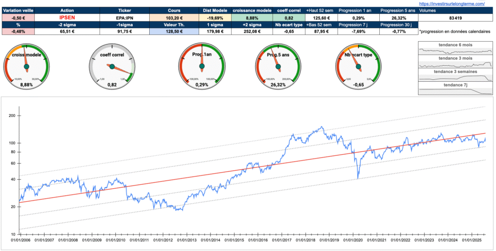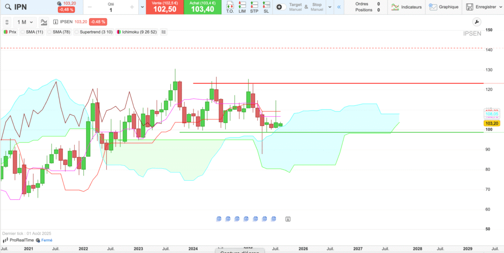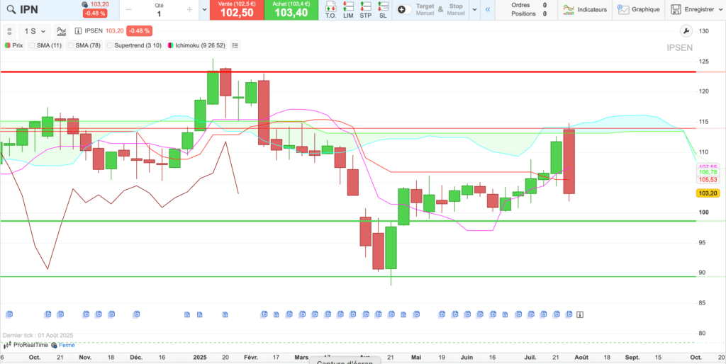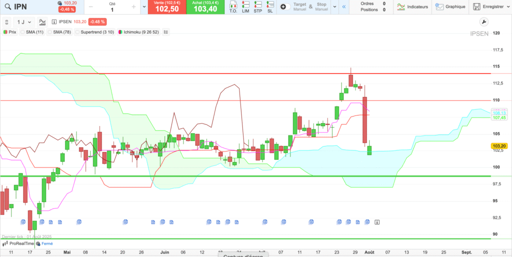 en UT journalière, la tendance reste positive avec cependant quelques éléments : la cassure de la kijun et tenkan validée par la bougie suivante indique une validation de changement de tendance relativisée par la lagging span qui est triplement bloquée par les cours la tenkan et la kijun d’il y a 26 périodes en arrière, c’est donc possible un scénario de rebond sur les cours actuels pour un retour vers les 110€ puis 113€ en ligne de mire. Je ne suis ni a l’achat ni a la vente sur Ipsen qui a de très bons fondamentaux