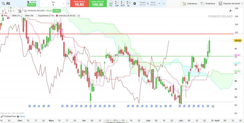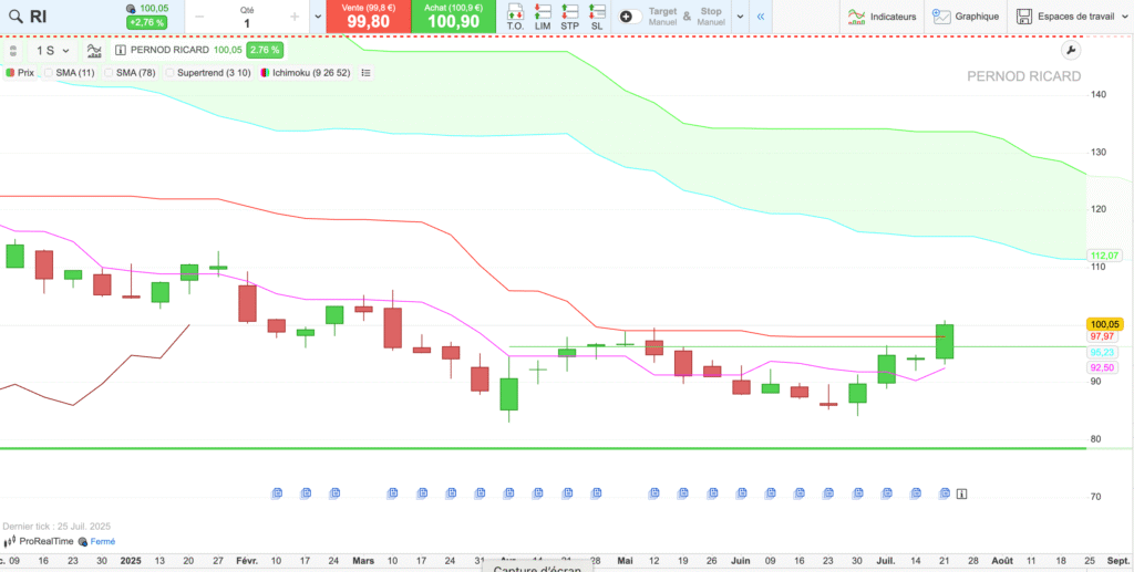 l’analyse en UT journaliere montre une tendance positive (les cours sont au dessus du nuage) et la lagging span a un horizon dégagé. Un premier niveau de resistance se trouve sur les 102€